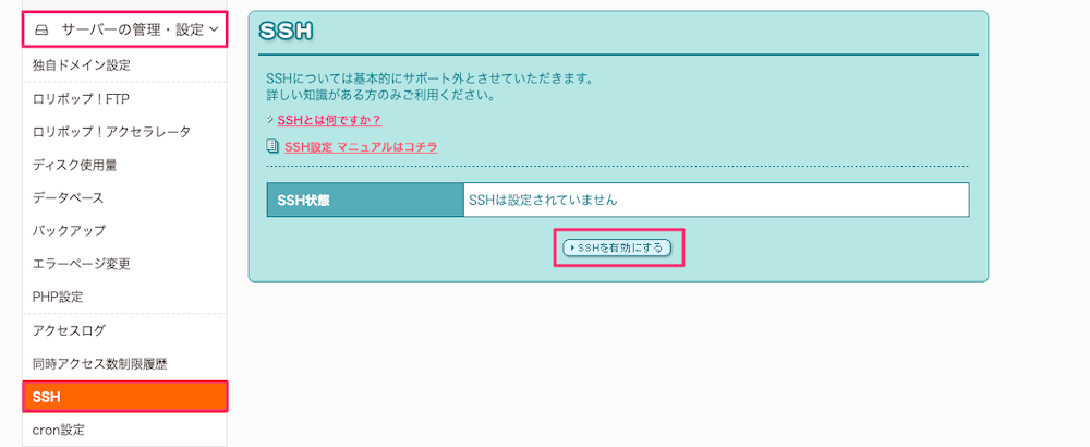 次の画像のページが表示されたら「SSHを有効にする」をクリックします。