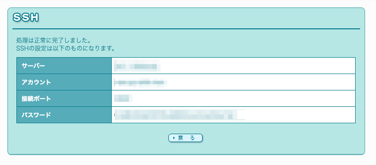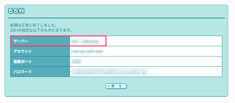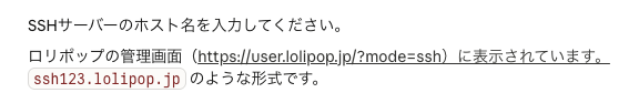 「ロリポップ!」のユーザー専用ページ(管理画面)から「サーバーの管理・設定」>「SSH」に表示される「サーバー」の情報を回答します。