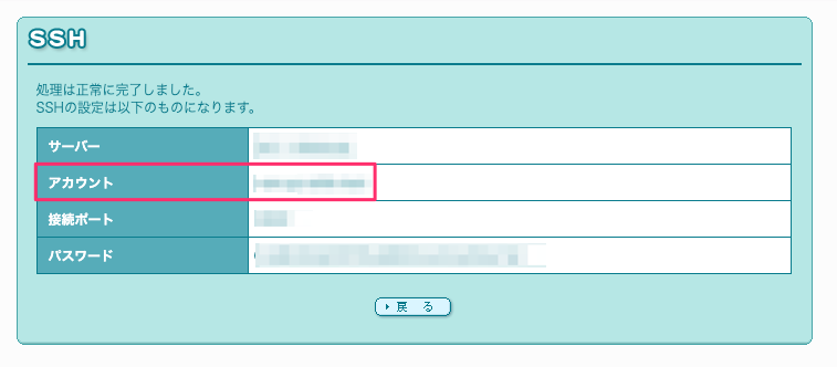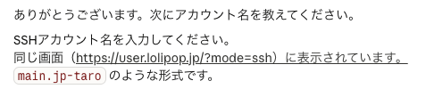 「ロリポップ!」のユーザー専用ページ(管理画面)から「サーバーの管理・設定」>「SSH」に表示される「アカウント」の情報を回答します。