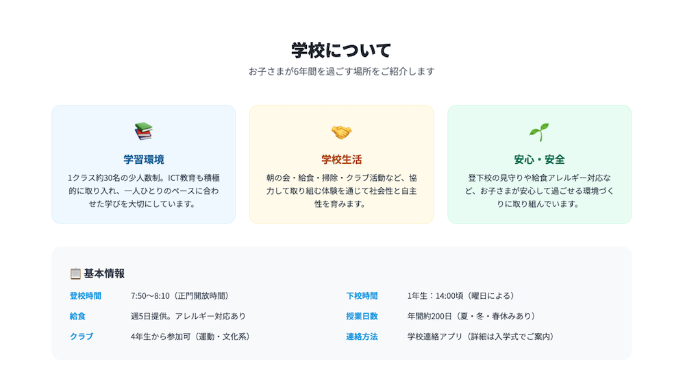 Claude codeに伝えた指示は「小学校入学を控えた子どもをお持ちの保護者向けに、学校の説明と入学に必要な持ち物を案内するLPを作って」のみですが、次の画像のように細かい表現が盛り込まれたサイトに仕上がりました。