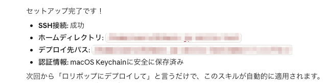 Claude code上で「セットアップ完了です」と表示されたら、SSH接続は成功です。