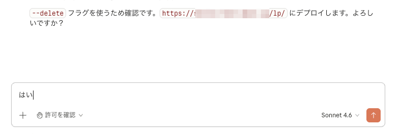 Claude codeでLPの作成が完了すると、デプロイ先のフォルダ名を聞かれます。