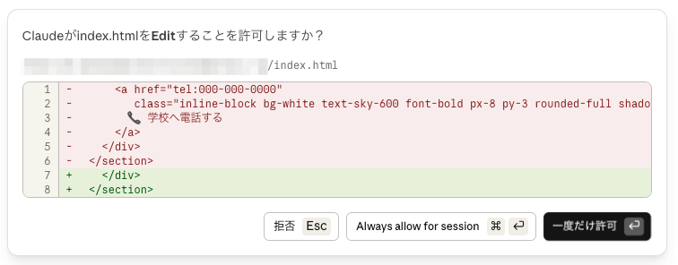 今回公開されたサイトの下部にあった「学校へ電話する」ボタンを、AIエージェントを通して削除してみます。