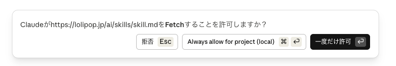 Claude codeは、指定したディレクトリ内のファイルの読み取り、書き込み、実行を行う可能性があるため、行う作業に対して「一度だけ許可するか」「常に許可するか」「拒否するか」をたびたび聞かれます。常に許可するのが不安な場合には「一度だけ許可」にしておくと良いでしょう。