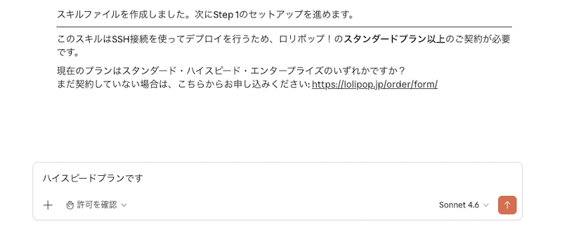 「AIエージェント Skills」を使うには、「ロリポップ!」のSSH機能が使えるプラン(スタンダード/ハイスピード/エンタープライズ)が必要です。SSHが使えるプランは、利用料金のページで確認いただけます。