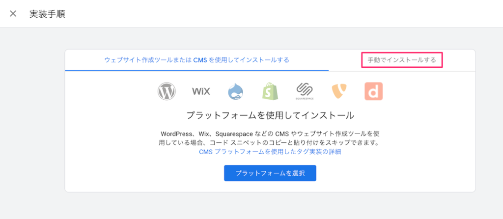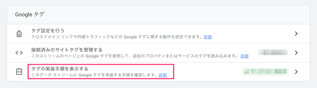 画面の右下あたりにある「タグの実装手順を表示する」をクリックします。