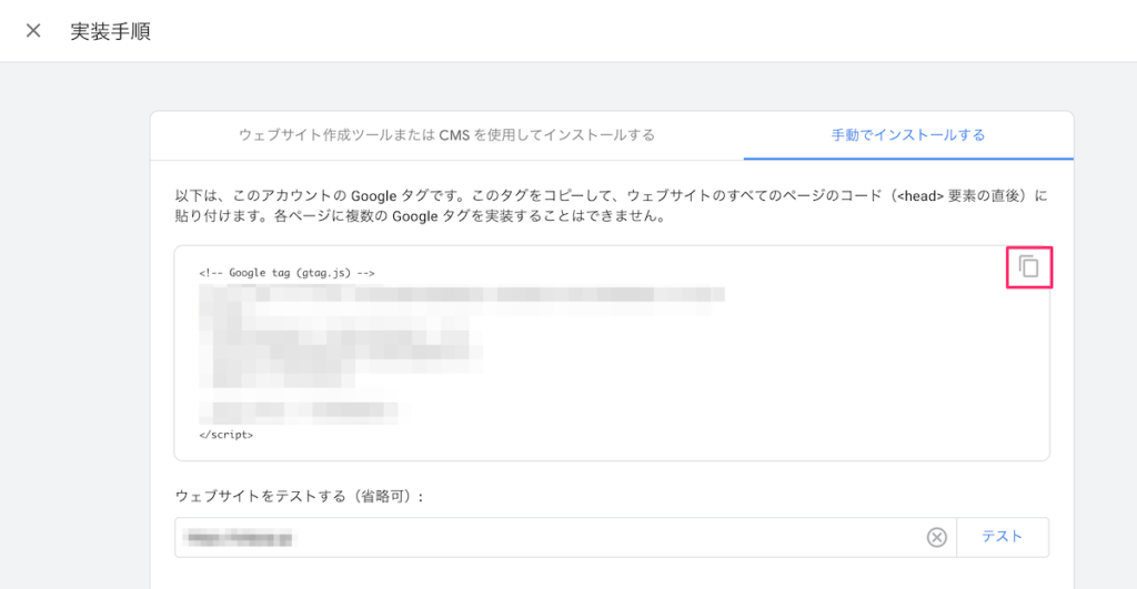 Gooleタグが表示されるため、コピーしておきましょう。右上のアイコンをクリックするとコピーできます。