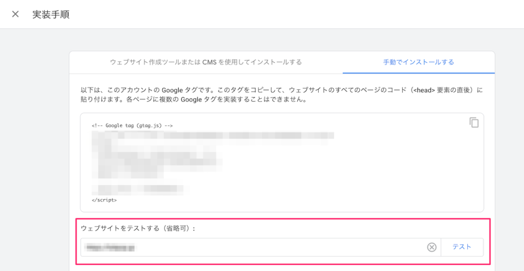 GoogleアナリティクスのGoogleタグを確認する画面で「ウェブサイトをテストする>テスト」をすることで正しく設定がされているか確認できます。