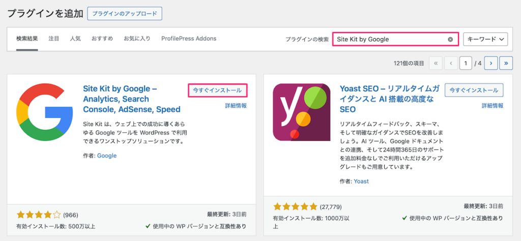 「Site Kit by Google」が表示されたら「今すぐインストール」をクリックします。